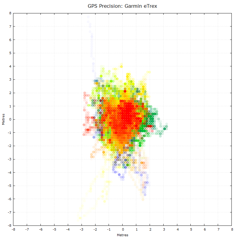 Here’s a graph of those results. Centre of the graph is the position averaged over the full dataset. The colour of each point represents the age of the measurement from oldest to newest – blue, green, yellow, orange and then red.